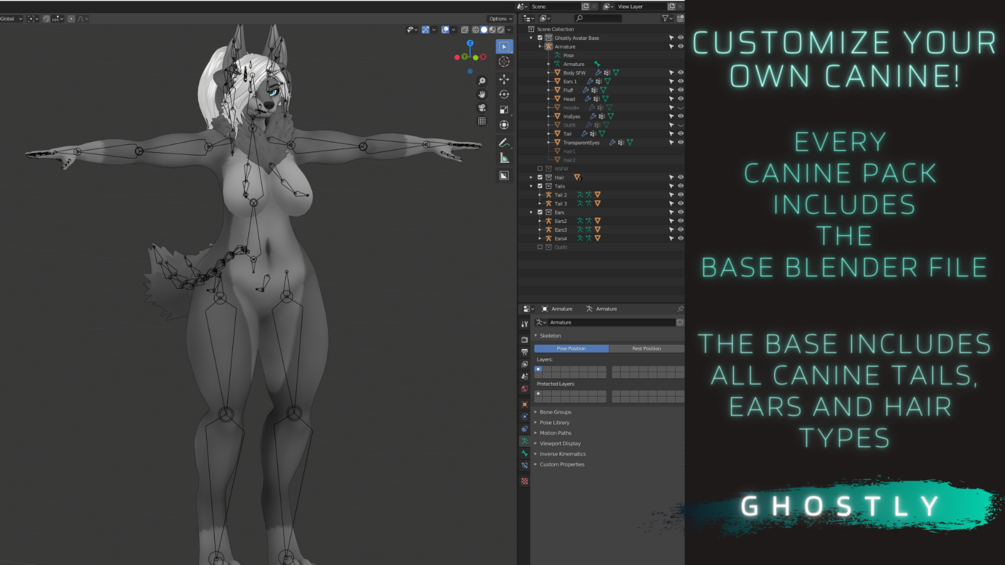 Introducing Ghostly's Female Canines, for those who want to be soft fluffy pupper. Immersive base model for social platforms. (Currently set up for VRChat.)