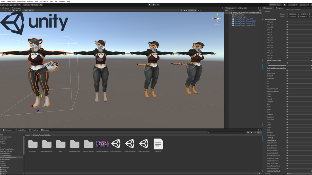 Unity package includes the Ghostly Female Felines: WILD CATS. Model and texture source files are included for customizations.